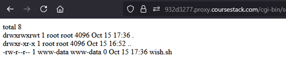 To list the contents of the /tmp directory, I first ran this command. As suspected, there was nothing in the directory.